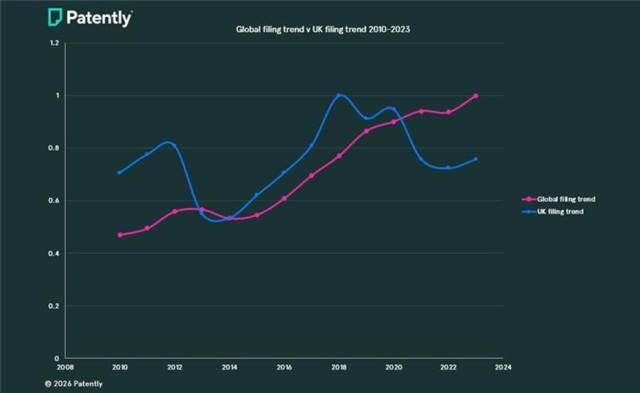图1为一张经过归一化处理的图表,展示了全球范围,以及英国本土企业在光子学领域的专利申请趋势。在该时间段内,全球专利申请量持续增长,反映出全球光子学技术发展的长期加速态势。相比之下,英国的情况则更为波动,其特征是在2010年代后期出现明显激增,随后在新冠疫情之后短暂回落,并在近几年重新恢复增长。