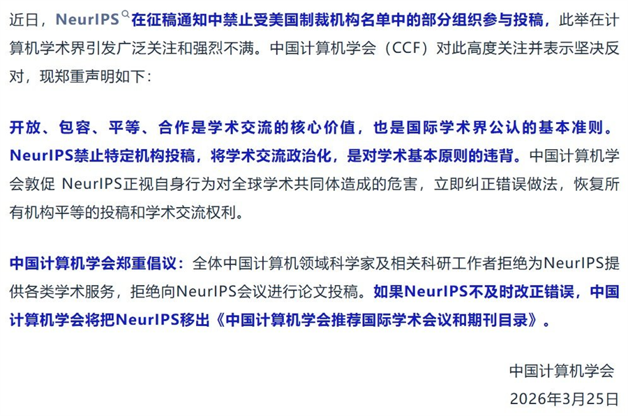 事件发酵后,中国计算机学会(CCF)于3月25日发布严正声明,明确表示坚决反对NeurIPS的这一做法。声明指出,开放、包容、平等、合作是国际学术界公认的基本准则,NeurIPS将学术交流政治化,违背了学术本质,同时倡议全体中国计算机领域科学家自觉拒绝为NeurIPS提供各类学术服务、拒绝投稿,并警告若NeurIPS不及时纠正错误,将把其移出《中国计算机学会推荐国际学术会议和期刊目录》。这一警告分量极重,意味着NeurIPS若坚持原有政策,将在中国学术评价体系中失去权威性,进而影响其在全球范围内的影响力。
